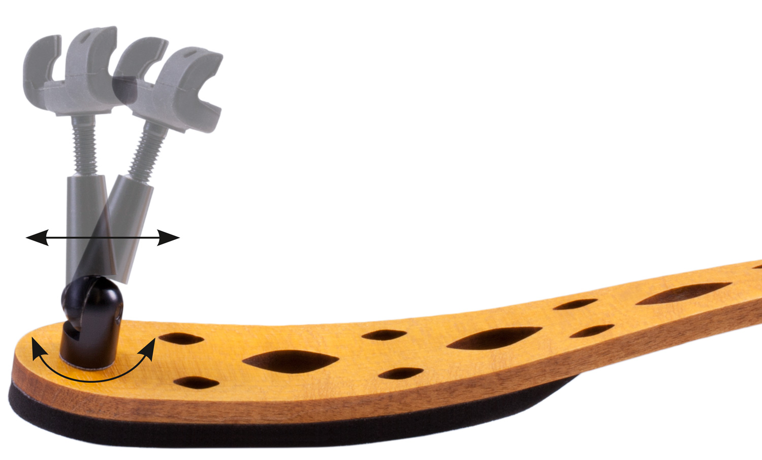 When not attached, the two hinge joints of the KorfkerRest lean slightly towards each other (see picture 4). In order for them to do so and to ensure the ideal position of the wooden bridge in relation to the instrument, whatever adjustment is made needs to be divided between the shoulder leg and the chest leg.